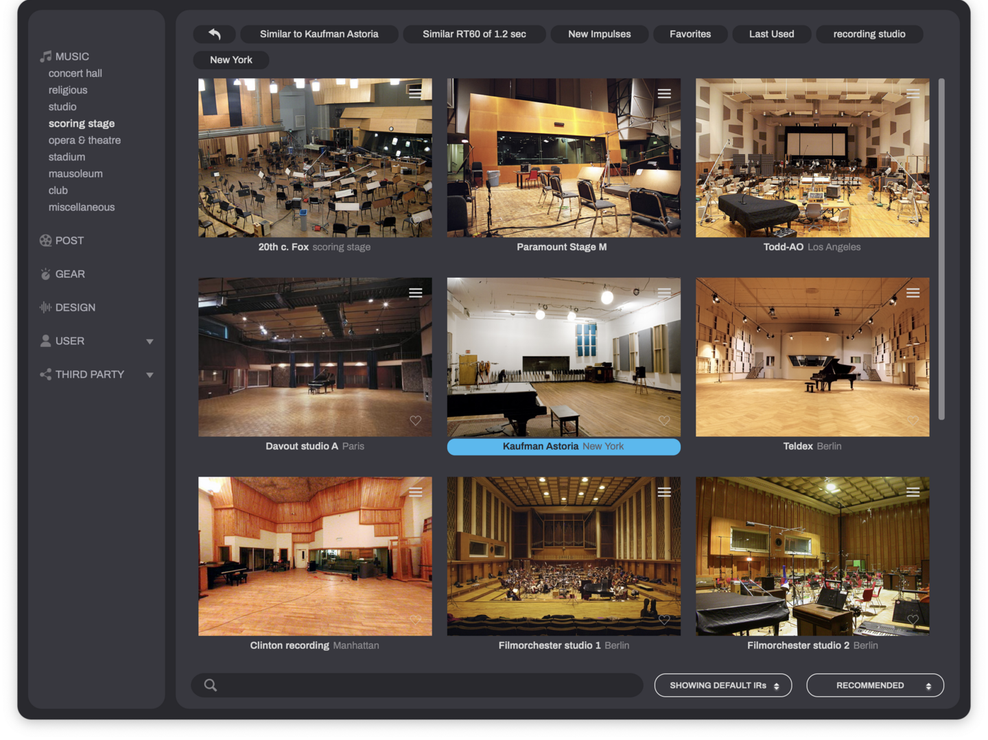 ビジュアル要素充実の画面が刷新。膨大なインパルス・レスポンス(IR/空間の音響特性データ)ライブラリへのアクセスが、さらに容易となりました。画像のクリックのみで適用、継ぎ目のない読み込み、相似空間の提示、残響時間による分類、お気に入り設定も、ブラウザ画面による機能の一部です。キーワード検索や新しいIRのダウンロードとインストールも、1クリックで完了。
