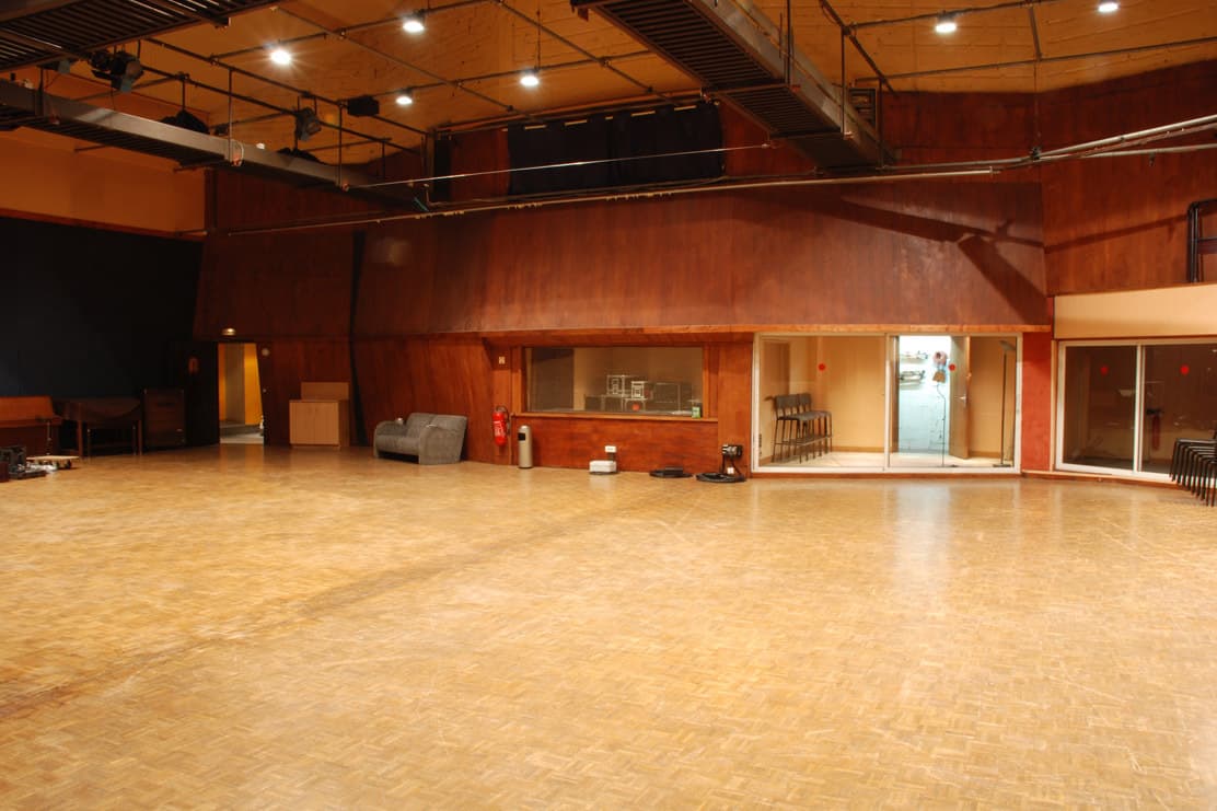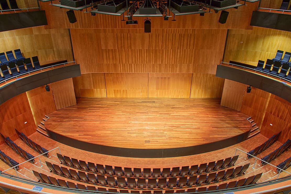 半円形の広い空間に設置されているのは座席のみ。どの場所においても観客と出演者の距離が近く、2つのバルコニー席からもステージを一望できます。全面が木製の内装と座り心地の良いシートは、より暖かく親しみのある雰囲気を醸し出します。