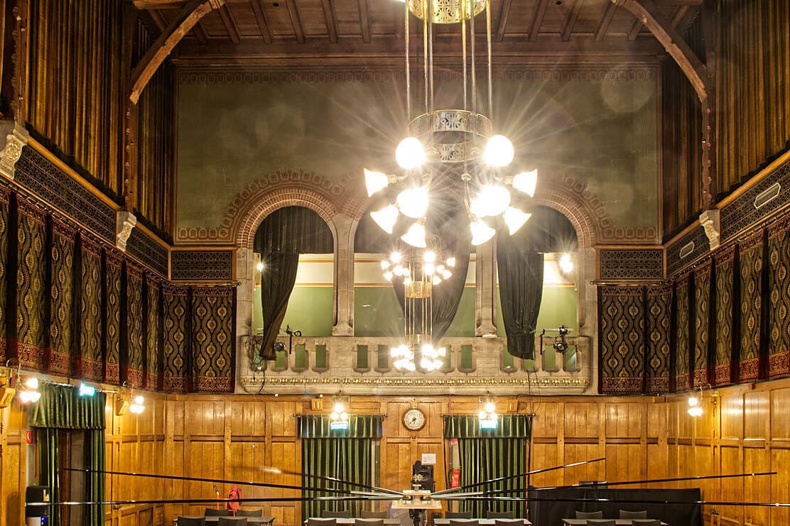 このホールは、建築家ベルラーヘによる最高傑作とも称されています。元々は商工会議所の会議室であり、厚手のカーペットは1903年のオリジナルのままで、今回のIRのサウンドにも大きく影響しています。