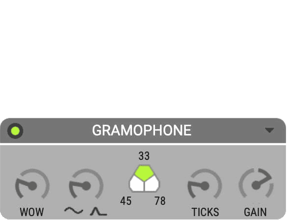 蓄音機シミュレータです。WOW(中心から外れた回転)とCURVE(レコードの反り)によるピッチ変動を作用。併せてアナログレコード特有のノイズも付加します。