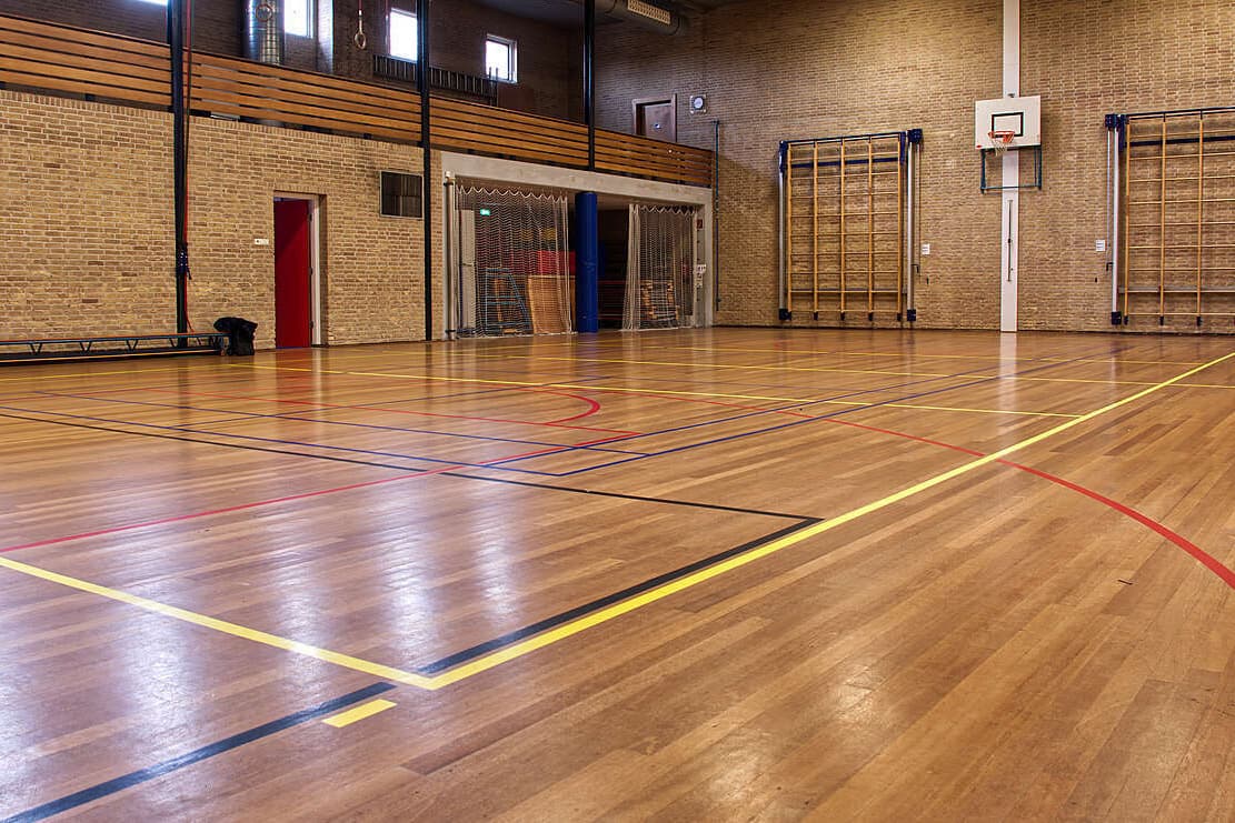 スポーツ関連の複合施設、Sporthal Schalkwijk内の体育館です。木製の床です。