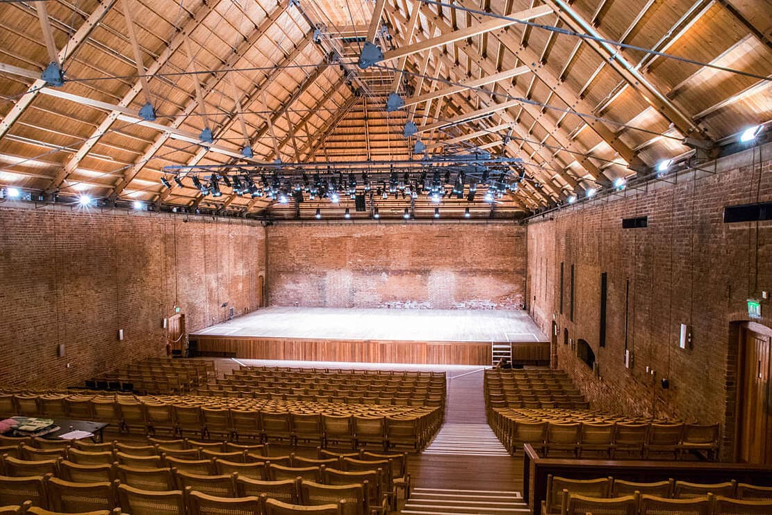 半円形の広い空間に設置されているのは座席のみ。どの場所においても観客と出演者の距離が近く、2つのバルコニー席からもステージを一望できます。全面が木製の内装と座り心地の良いシートは、より暖かく親しみのある雰囲気を醸し出します。