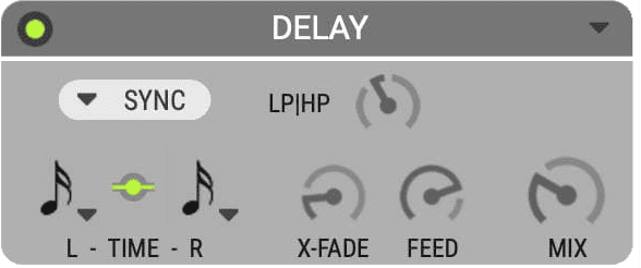 モノラル/ステレオ・ディレイ。フィードバックにはハイ/ローパス・フィルタを備えます。SYNCモードでは、ディレイのタイミングがDAWのテンポにロックします。その際はディレイ・タイムの調整ノブがノート表示に変更されて、セレクト・ボックスから音符の種類を選びます。