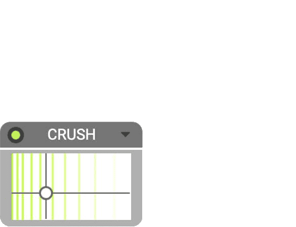 量子化ビット/サンプリング周波数の劣化調整です。十字マークを下方向にドラッグすると、量子化ビット数が32bit〜2bitの範囲で減少。左方向にドラッグすると、サンプリング周波数が減少。エイリアス効果を最大限に活かすため、非常に粗いサンプリング周波数の変換アルゴリズムが組み込まれています。