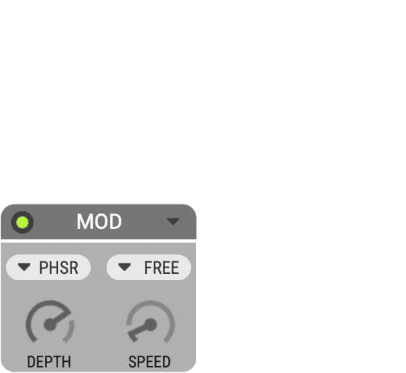 SPEED:モジュレーション発振のスピード調整。FREE/SYNCいずれのモードでも設定できます。SYNCモードではモジュレーション効果のスピードがホストDAWのテンポにロックされて、音符の種類を選択可能。