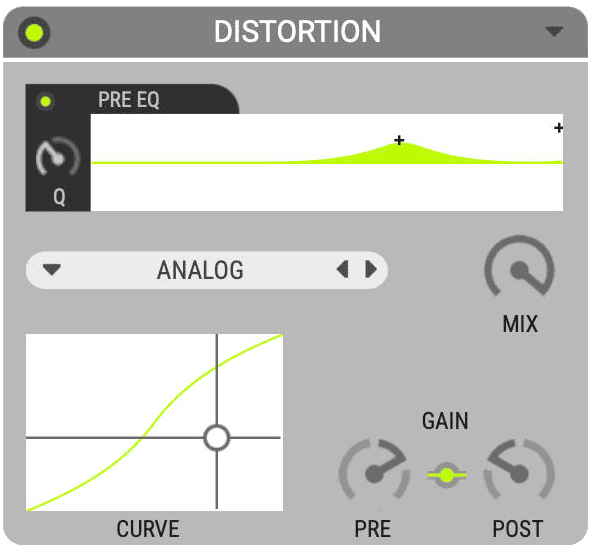 スピーカーやアンプの歪みをエミュレート。まず音声信号はPre EQ(パラメトリックEQとレゾナンス搭載のローパス・フィルタ)を通過します。その後のPRE GAINでは入力信号が増幅されて、次のTYPE(ディストーションのタイプ)で歪み、さらに下部のCURVEで調整されます。POST-GAINは、このモジュールの出力レベル設定です。PRE-POST間の丸印をクリックすると、両パラメータを反比例させて調整可能。